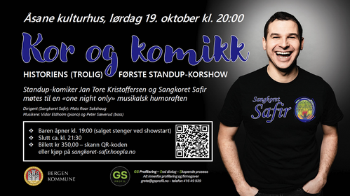 Den 19. oktober 2024 arrangerte Safir "Kor og komikk" i Åsane kulturhus. I overkant av 100 publikummere fikk en kveld med en miks av humor og sang - med oss hadde vi standup-komiker Jan Tore Kristoffersen, mens Vidar Eldholm og Peter Sæverud sto for det musikalske akkompagnementet.