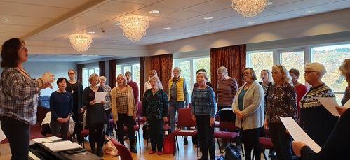 Helgen 28. - 29. januar hadde vi seminar med Anne Randine Øverby på Åsane Folkehøgskole. Det var en veldig inspirerende og lærerik helg. Vi var ca 29 deltakere. Det ble lagt mye vekt på pusteteknikk og det var nok mange av oss som fikk en aha-opplevelse i den forbindelse. Vi fikk en liten innføring i at noen vokaler og konsonanter er mer syngbare enn andre. Mye av tiden ble brukt til å trene på munnstilling for å få bedre utnyttelse av resonans fra alle hodets hulrom. Vår dirigent Gisken fikk for en gangs skyld sitte sammen med oss i koret. Vi takker Anne Randine Øverby for en kjempeflott helg!